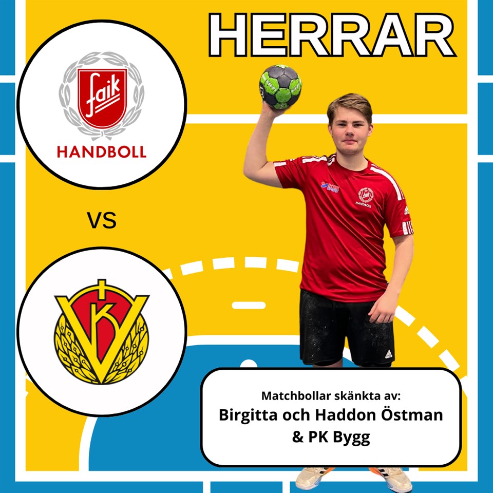 Herrar Falköpings AIK Herrar vs Vårgårda IK HK Tisdag 23/1 Kl. 19:30 Odenhallen Matchbollar skänkta av: Birgitta och Haddon Östman & PK Bygg Entré 50kr, Pensionärer 40kr. Välkomna! KÖÖR FAIK!